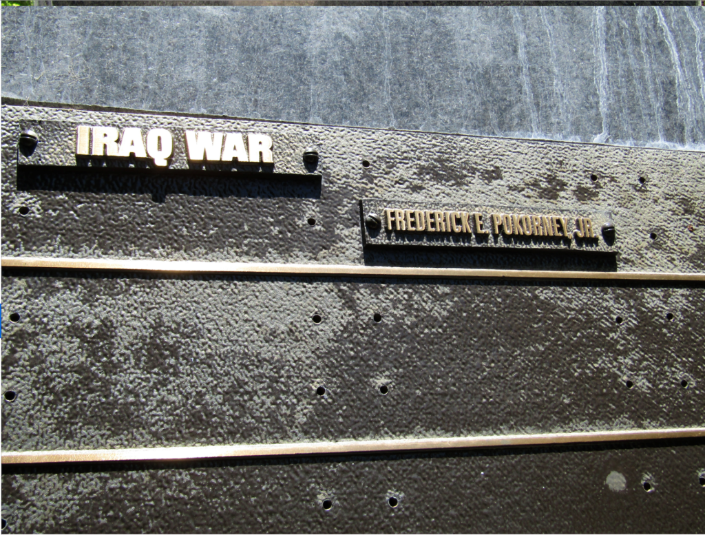 Tall, four-sided monolith, with metallic lettering on three sides.