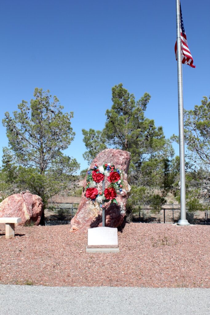 Small, light reddish colored marble tombstone-style with white lettering. Inscription reads, “Freedom is not free. Our gratitude to those who have served our country. Boulder City Republican Women.” The memorial stands next to a tall flag pole that flies an American flag. The site also includes a bench, and large, decorative boulders.