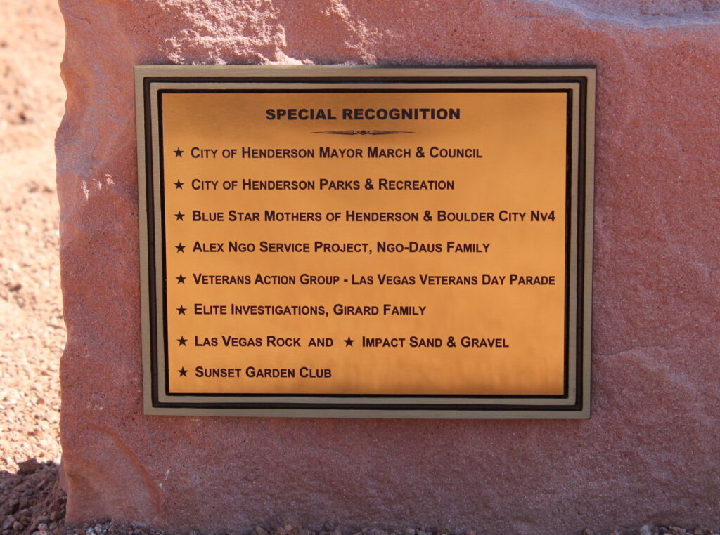 Dedicated Sept. 30, 2020. The project began as an Eagle Scout proposal by Boy Scout Alex Ngo of Boy Scout Group 228. Although the Scouts did not move forward with the project, Ngo contacted several other non-profit groups including the Sunset Garden Club, the Veterans Action Group, and the Blue Star and Gold Star Mothers, and wrote a formal proposal. He presented it to the Henderson Park District, which gave approval for the project and donated a site in Acacia Park. Monetary donations were sought, and monies and donations in kind were obtained.