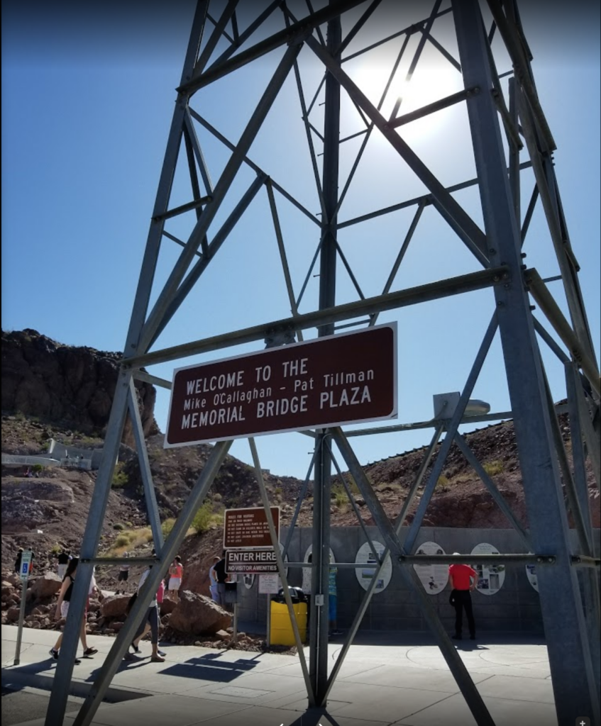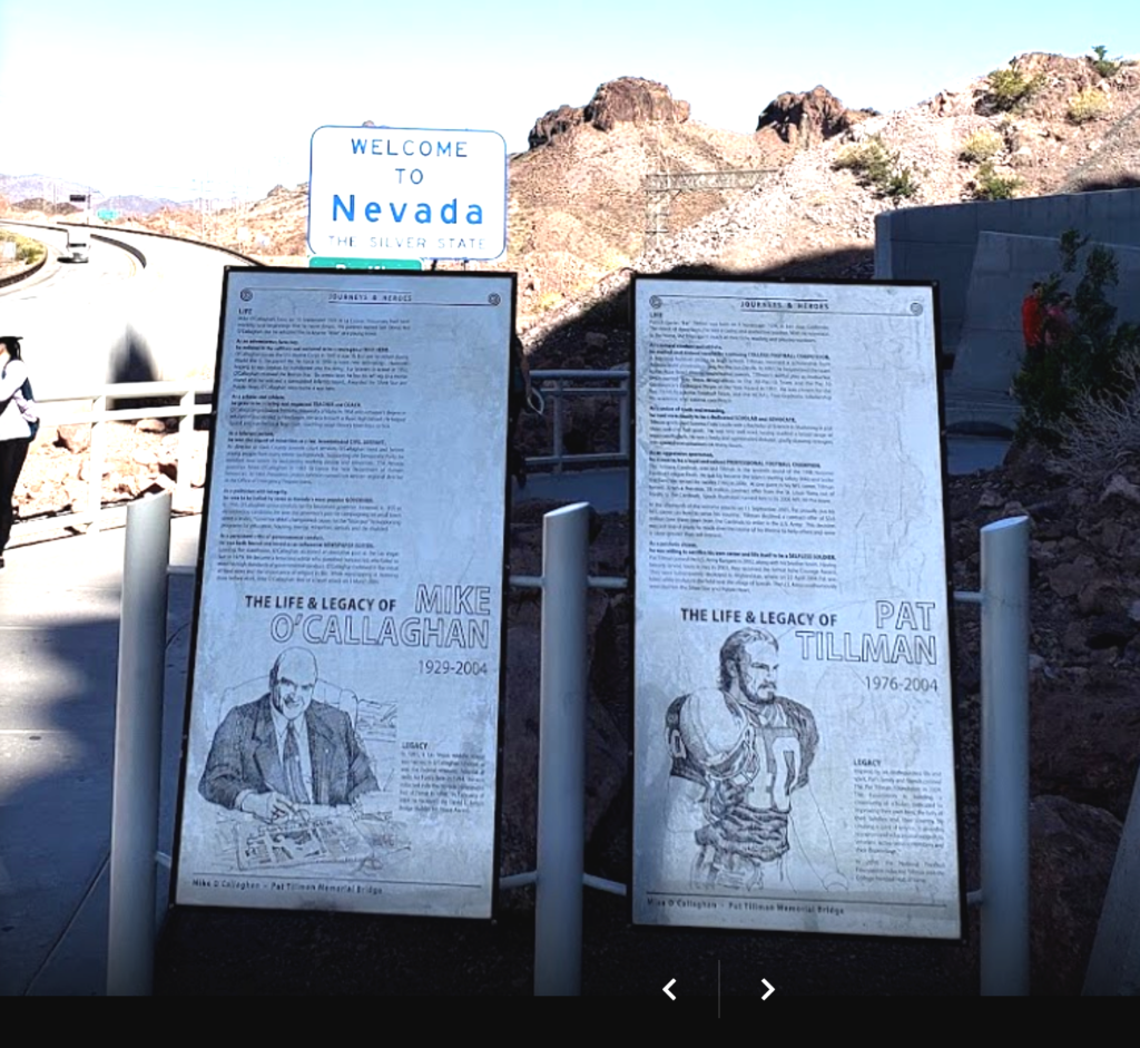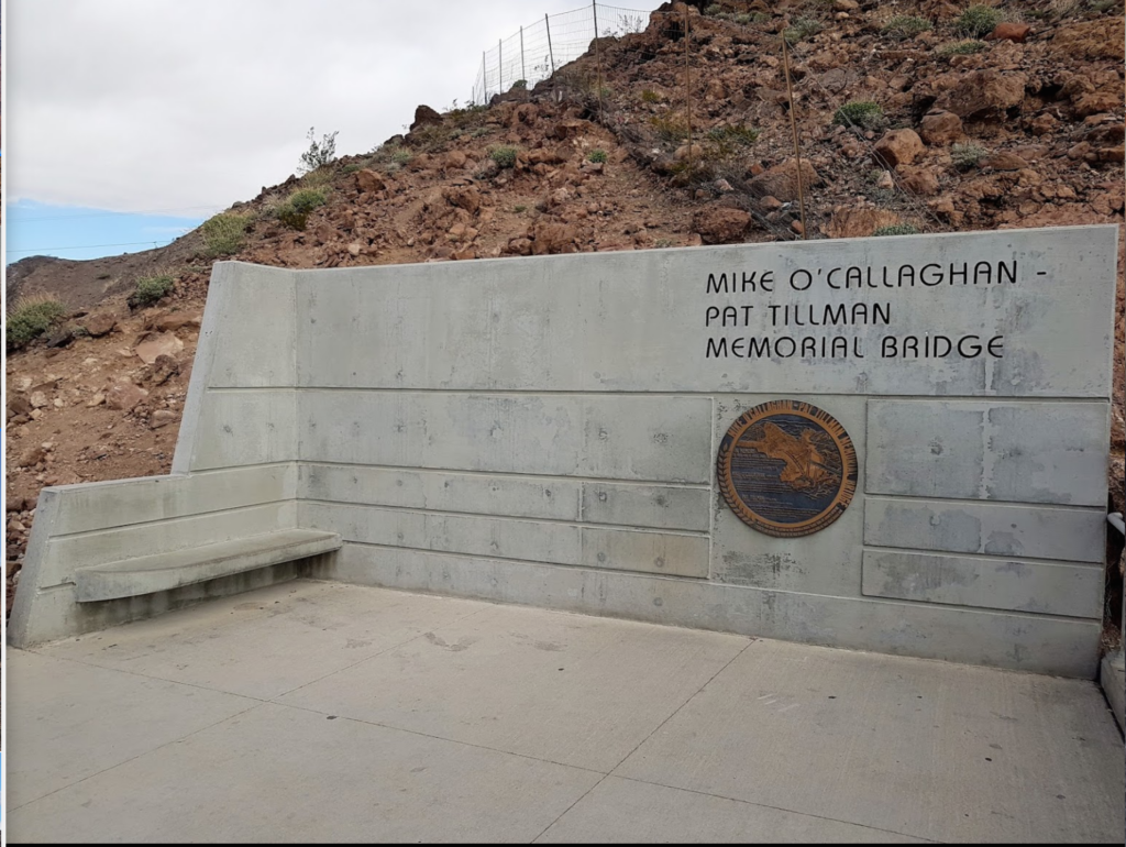 When Hoover Dam construction was completed in the 1930s, Nevada automotive traffic to and from Arizona (and vice-versa) required vehicles to cross over the main highway that runs over the dam. As years went by, increased business and visitor traffic regularly clogged up the road. Talk of a “Boulder City bypass” had been bandied around for many of those years. In addition to cost, another drawback was the fact that much tourist traffic would be routed around the town’s main street, and local business would suffer. Construction began in 2005. In 2010 the bridge became a reality, and business has suffered. Several businesses have had to close their doors since the bridge was built. The bridge is named for two veterans, one from Nevada and one from Arizona. As stated on one of the bridge memorials: “Mike O’Callaghan, 1929-2004. Sgt. USMC – Cpl USAF – Sgt USA – Governor of Nevada. Donal Neil “Mike” O’Callaghan was a devoted family man who honored God and country in lifelong service to the public. He practiced high standards of conduct, respect, and diligence in his civic work to improve life for ordinary people. Pat Tillman 1976-2004. Football athlete – #42ASU – #40 AZ Cardinals – Cpl USA. Patrick Daniel “Pat” Tillman was a loved son, brother, husband, and loyal friend who was willing to sacrifice fame, fortune, and his own life for his ideals. His family, friends fans, and nation lost Pat in military service to his country and brothers-in-arms.