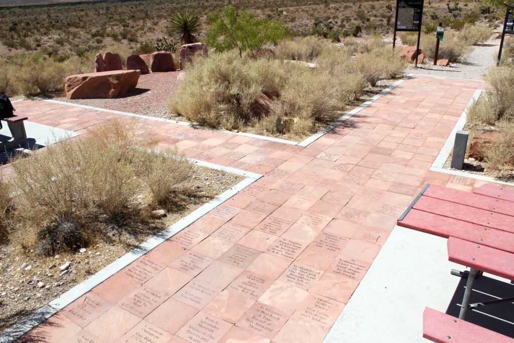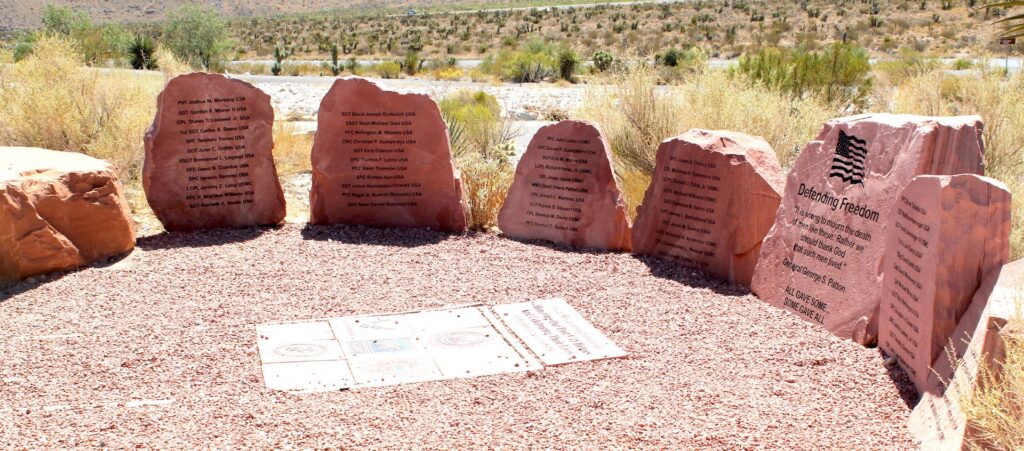 Multi-piece memorial located in a plaza connected to a picnic area inside the Red Rock National Conservation Area on the western edge of Las Vegas. There are two larger identifiable items sur-rounded by smaller engraved rocks. The main piece is a large red rock with an engraving of an unfurled American flag, that reads, “Defending Freedom. It is wrong to mourn the death of men like these. Rather we should thank God that such men lived. George S. Patton. All Gave Some…Some Gave All.” A second larger piece reads, “In war, there are none left unwounded. Honoring our Post 9/11 Heroes and Celebrating Their Lives. September 11, 2001 – Forever.” Be-neath the engraving, there are depictions of U.S. military logos — U.S. Navy, U.S. Marine Corps, U.S. Air Force, U.S. Army, U.S. Coast Guard. Smaller boulders are engraved with names, ranks, and military services individual members of the armed forces were a part of — Nevada residents who died in combat since 9/11. A third boulder is engraved with the wording: “September 11th Memo-rial. This memorial is dedicated to the thousands of innocents who lost their lives during the terrorist attacks on September 11, 2001. It also honors those brave men and women who risked their lives in the rescue efforts. Friends of Red Rock Canyon, Red Rock Canyon Interpretive Association, the Bureau of Land Management, and Aquarius Stone Products worked together to create the nation’s first permanent memorial to commemorate this tragic event. This tribute to the victims and heroes was conceived on September 14, 2001, and was formally dedicated on September 29, 2001. There are also individual tiles purchased by families and friends of any individual (veteran or not) with messages of honor. This particular area is administered by the Friends of Red Rock Canyon for the Bureau of Land Management.